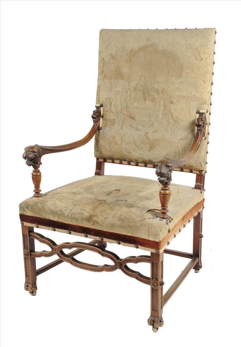 A continental carved and turned walnut open armchair in early 18th century style, with tapestry covered back and seat on brass castors.