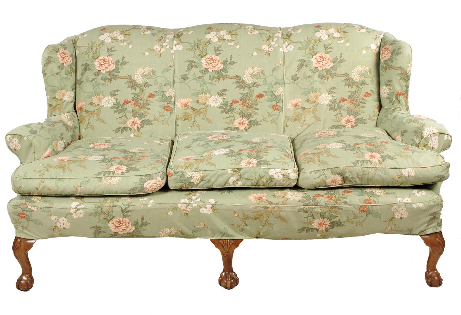 A wingback settee, on walnut shell and husk carved cabriole legs with claw and ball feet, 41in (104cm) high, 75in (190.5cm) wide, 32in (81cm) deep.