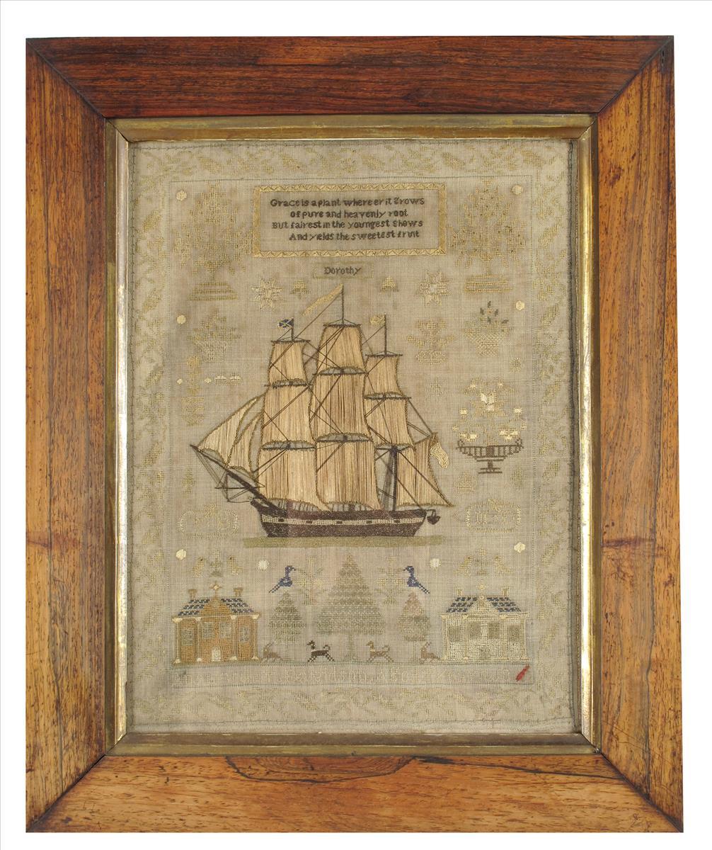 ‡An early 19th century needlework sampler, worked a verse, a three masted ship 'Dorothy,' flowers, 'T.D', 'M.D' column fronted houses, trees, animals and birds, 'Anstruther Davidson, Aged 7 Years 18..,' 15¼ x 11½in (38.6 x 29.2cm) in a later rosewood frame.