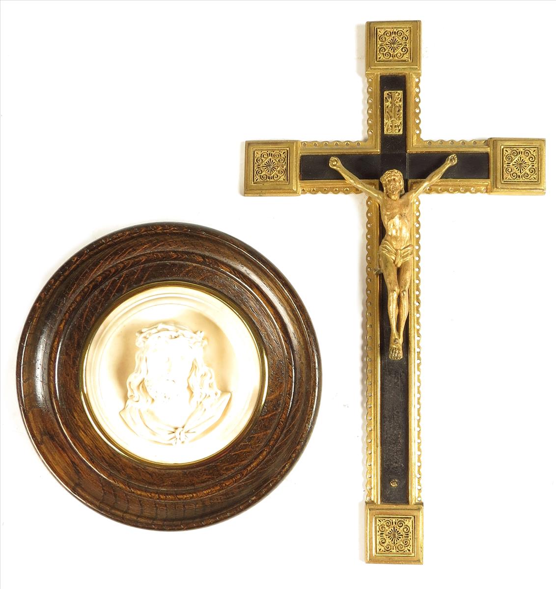 A German ormolu crucifix, 11½in (29cm) high, a relief rondel, bust of Jesus, inscribed 'DOGONPALE,' in an oak frame, 6¼in (16cm) diameter. (2)