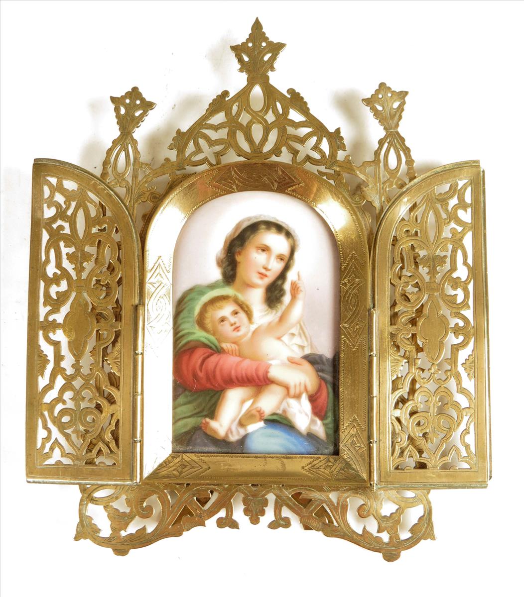 A porcelain plaque, painted Mary holding the infant Jesus, unsigned, in a pierced and engraved brass frame with doors, stamped on the easel 'MARION, LONDON,' 7½ x 5in (19 x 12.6cm).