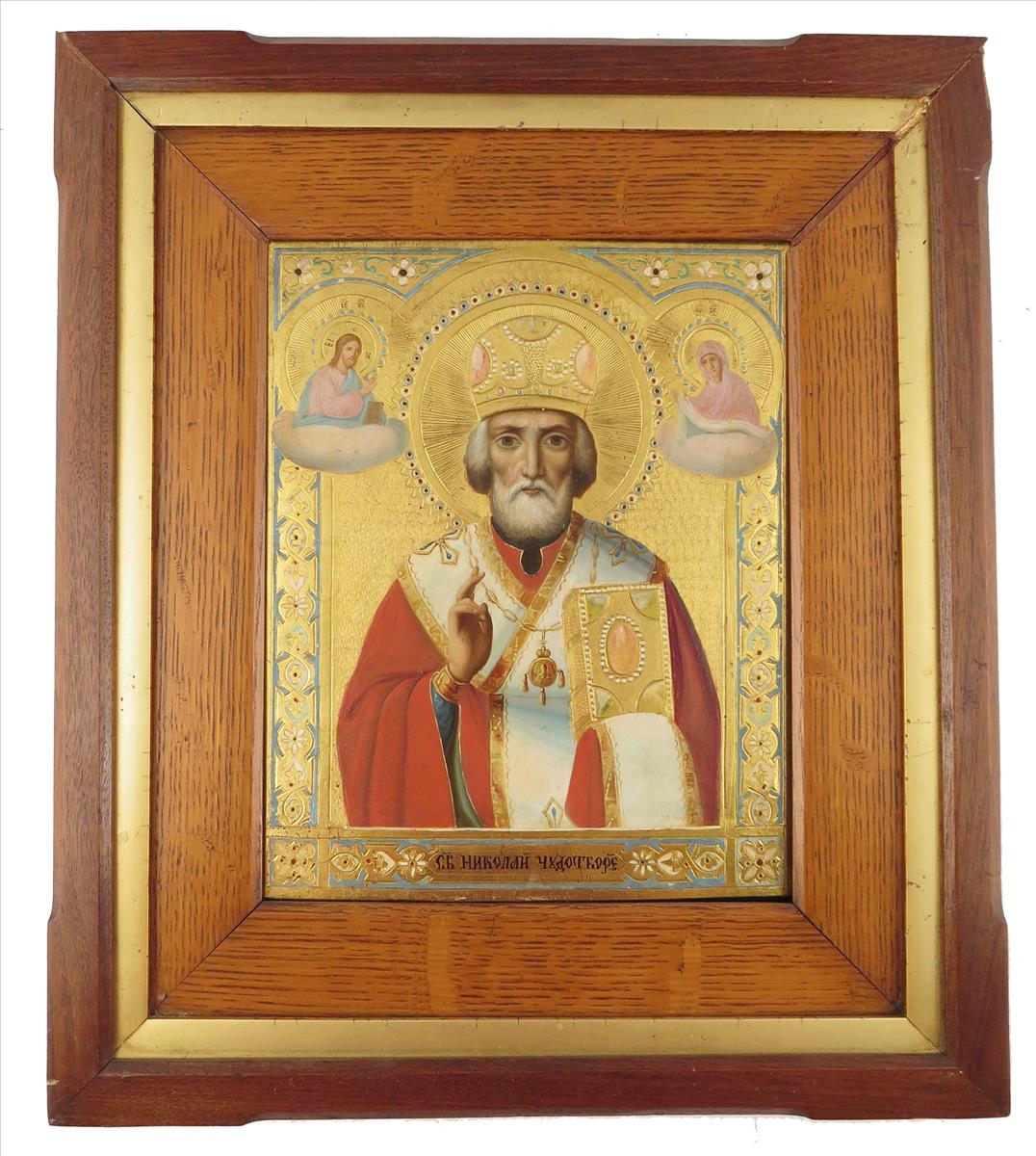 A late 19th century Russian icon, depicting Saint Nicholas of Myra, flanked by Jesus holding the gospels and the Virigin Mary with an omophorion, 10 x 8in (25.3 x 20.4cm), in an associated oak and walnut frame.