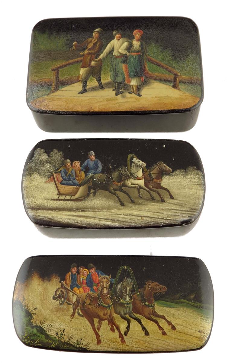 Three late 19th century Russian lacquer snuff boxes, the lids of two decorated with troika scenes, the other with three figures on a bridge, 1¼in (3.2cm) high, 3¾in (9.5cm) wide, 2½in (6.3cm) deep, max. (3)