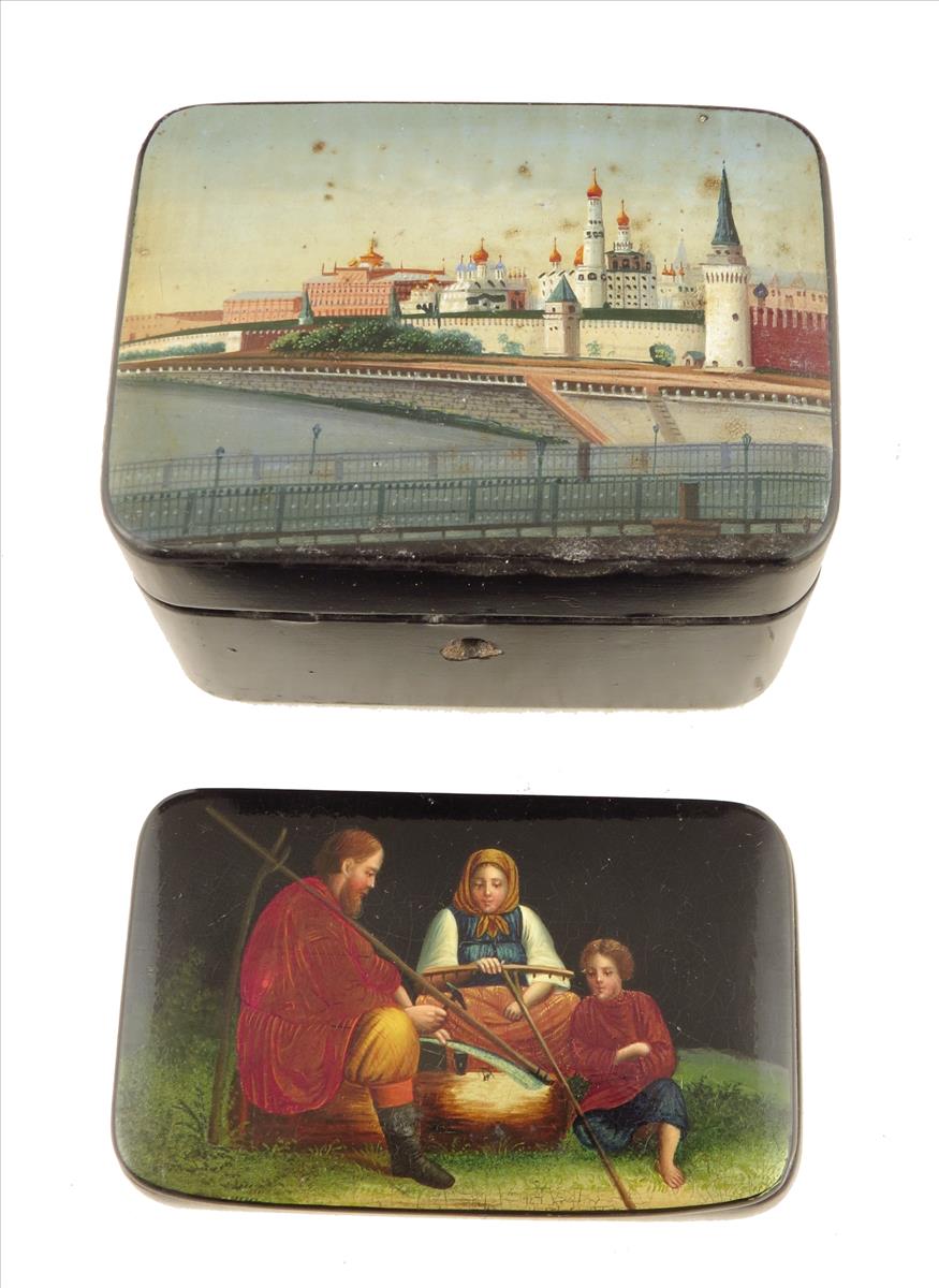 A late 19th century Russian lacquer box, the lid painted with a country family, the faux tortoiseshell interior with a gilt spreadeagle for Alexander III and with a signature 'Aykymana', 1in (2.3cm) high, 3¼in (8cm) wide, 2in (5cm) deep, together with another box the lid painted with a view of the Kremlin, the interior with gilt medallion marks. (2)