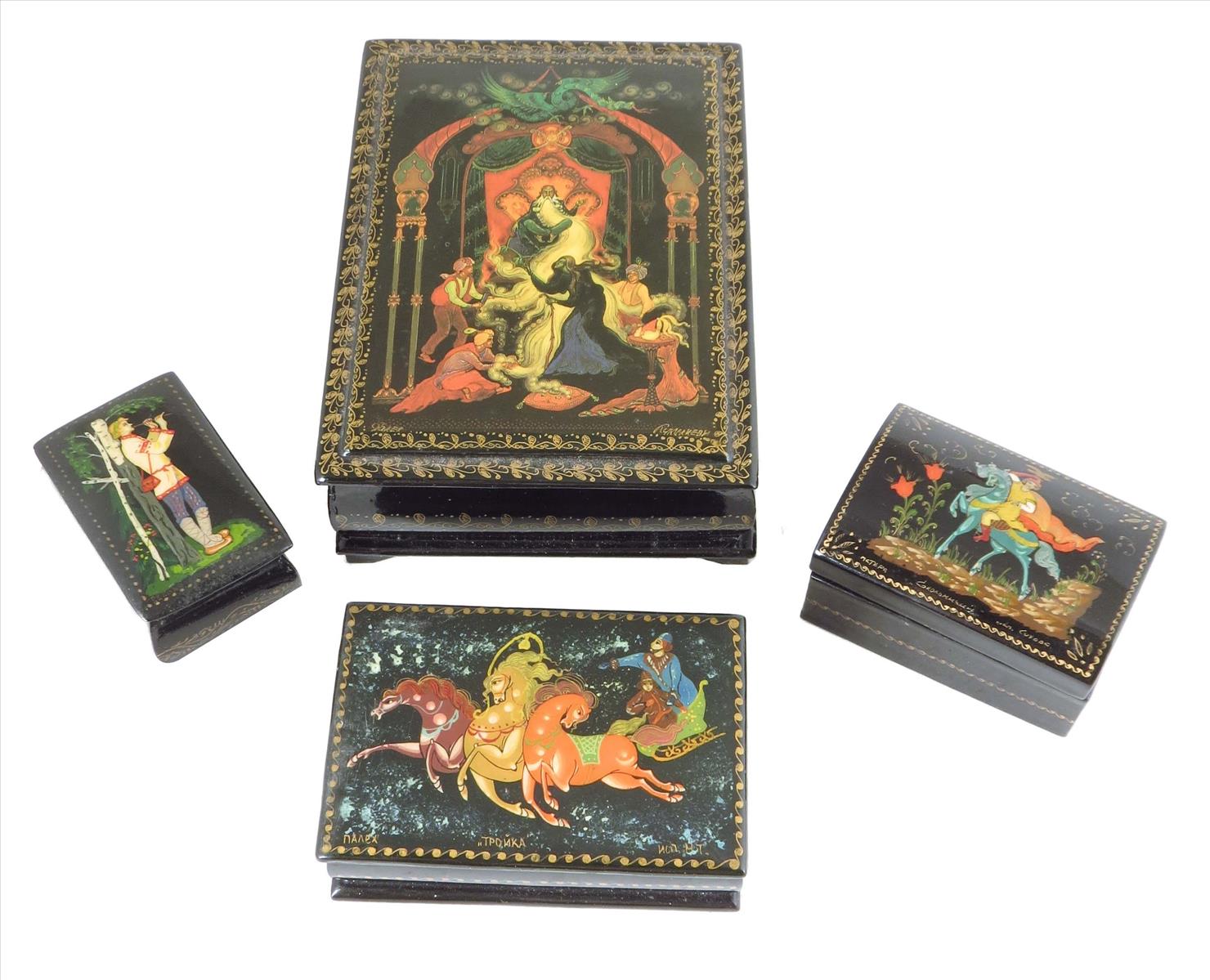 Four modern Russian lacquer boxes, decorated with fairy tale figures / scenes, three inscribed, one with a signature, 5¾in (14.4cm) wide, max. (4)