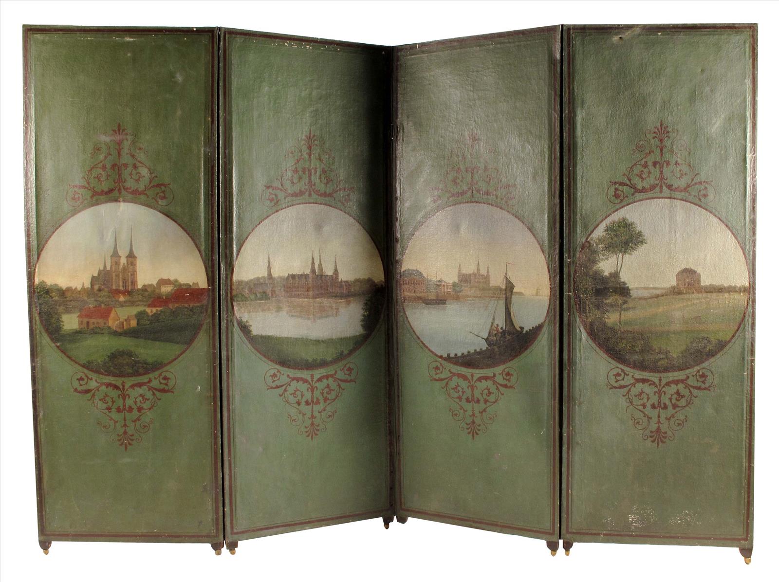 A 19th century Danish leather four-fold screen, painted with circular panels of landscape vignettes with views of Danish Royal palaces, 74¾in (189.6cm) high, 26½in (67.3cm) wide, each panel.