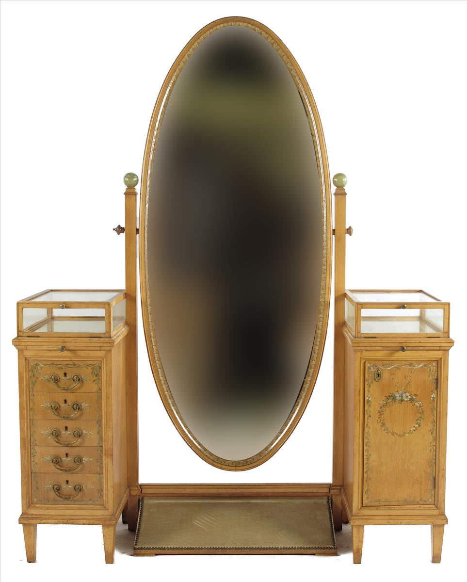 A German painted satinwood dressing mirror by Kimbel & Friederichsen, the oval bevelled plate to a leaf border and onyx finials, flanked with a pair of pedestals the tops with vitrines above pull-out slides, drawers to the left side and a cupboard to the right, with a central foot-rest, 76in (193cm) high, 58in (148.5cm) wide, 18in (46cm) deep.
