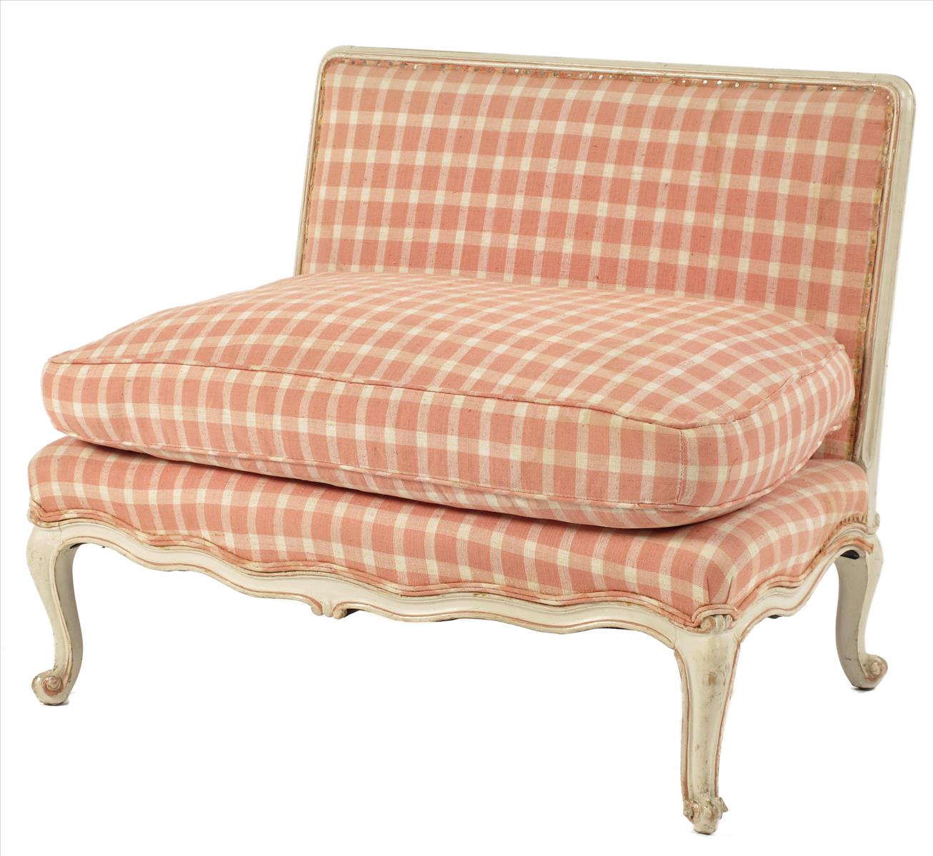 A French cream painted wood moulded frame low settee, with a squab cushion, 26in (66cm) high, 33in (84cm) wide, 20in (51cm) deep.