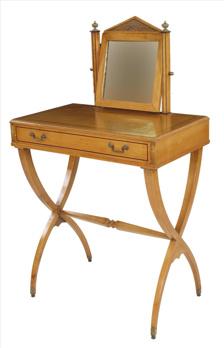 A 19th century Swedish birch dressing table, inlaid ebonised stringing, the frieze drawer with three compartments with a single hinged lid, 42½in (107.8cm) high, 25¾in (65.1cm) wide, 15in (38cm) deep.