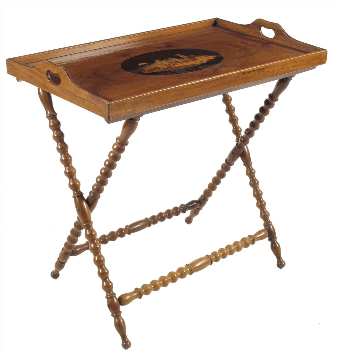 A late 19th century Sorrento olive wood and marquetry butler's tray on stand, depicting a rural scene with figures, with stringing and amboyna banding, with a folding bobbin turned stand, 29in (73.7cm) high, 29½in (74.9cm) wide, 17½in (44.4cm) deep.