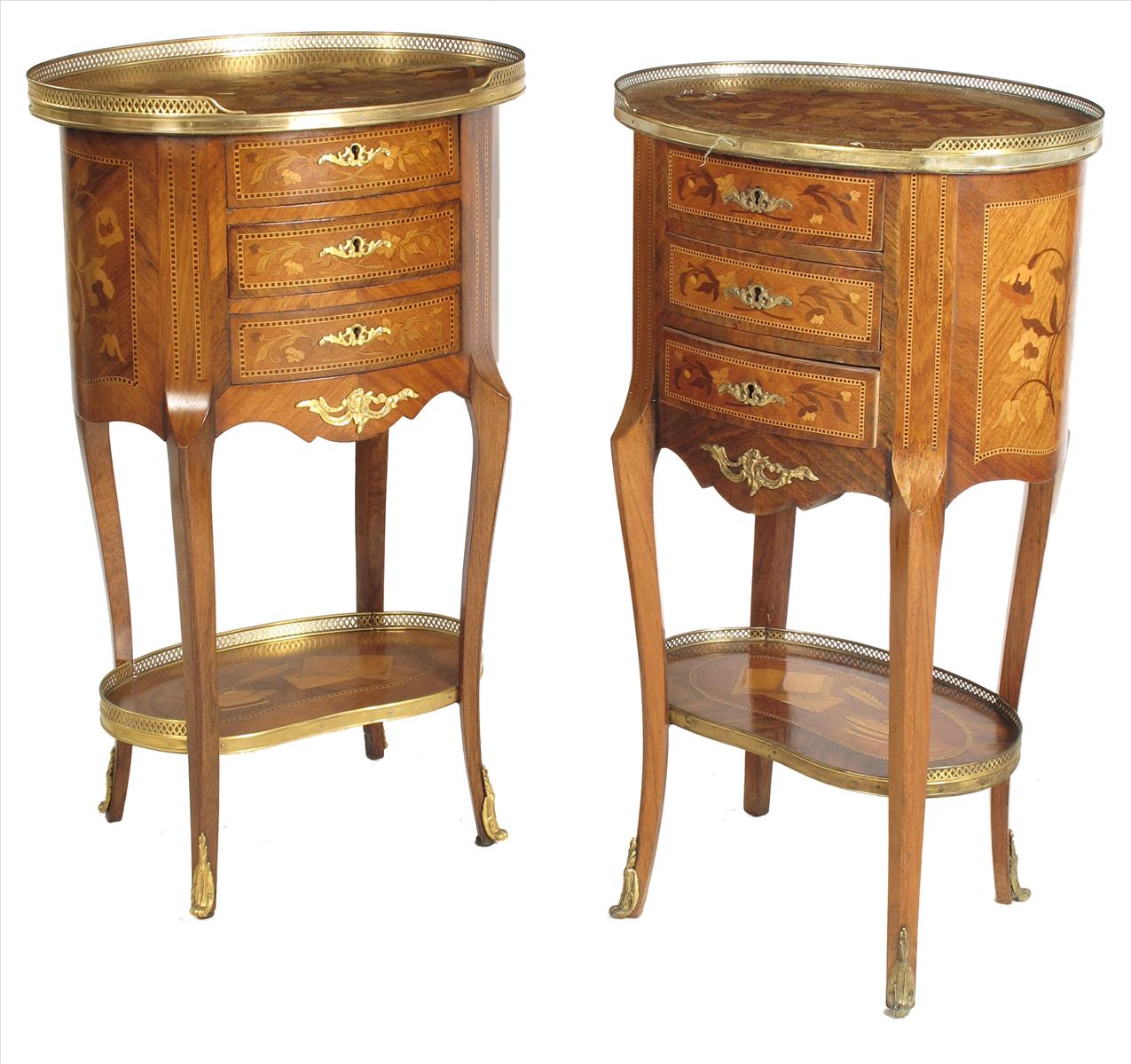 ‡Two similar French kingwood, rosewood and floral marquetry tables en chiffonière, with gilt brass mounts, each with a pierced gallery above three drawers, the undertiers inlaid with books and a quill and an inkwell, late 19th / early 20th century, 33in (83.6cm) high, 19½in (50cm) wide, 15in (38cm) deep max. (2)