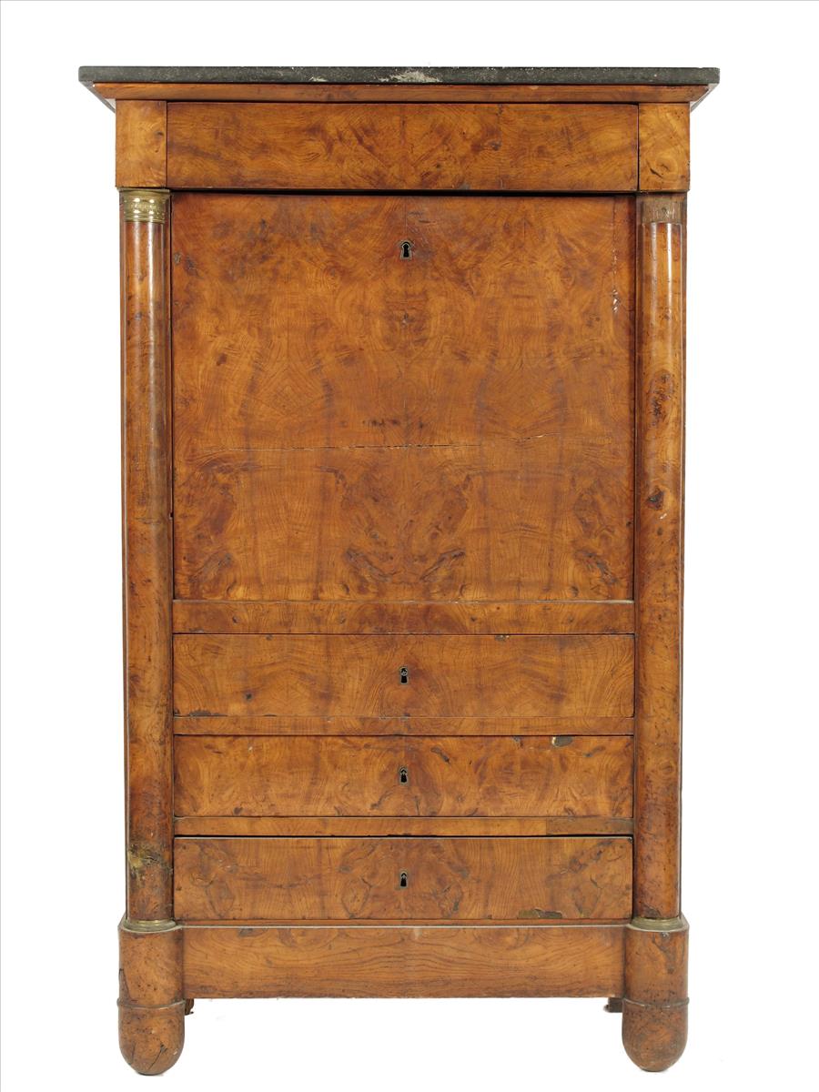 A 19th century continental ash secrétaire à abattant, with a marble top, the interior with a recess above drawers, 56¾in (144cm) high, 35in (89cm) wide, 17in (43.2cm) deep.