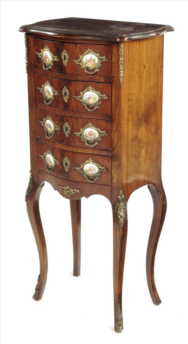 A French mahogany and beechwood serpentine chest of four drawers, with gilt brass handles with painted porcelain plaques, early 20th century, 33¾in (85.8cm) high, 15½in (39.3cm) wide, 11in (28cm) deep.