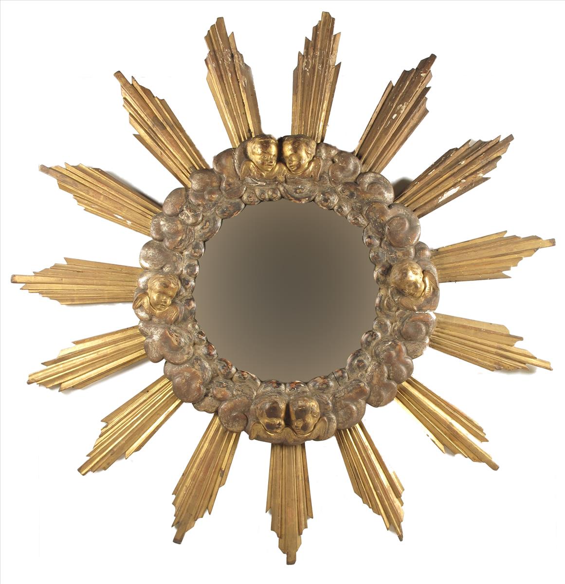 An Italian carved and giltwood sunburst mirror, with a convex plate to angels' head frame, issuing rays, 17th century and adapted, 51½in (130.8cm) high, 51in (129.5cm) wide.