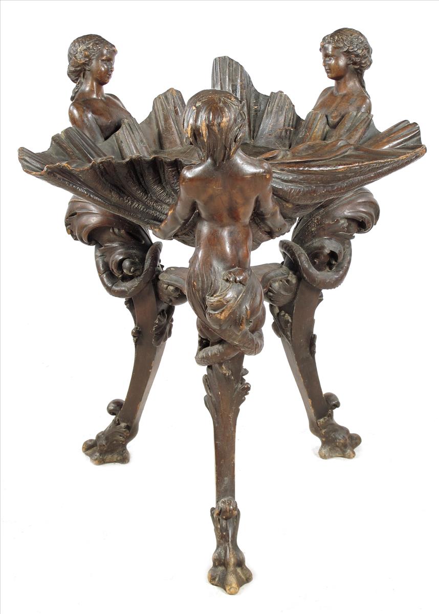 A late 19th century Italian carved and stained wood tripod basin by Vincenzo Cadorin, the shell bowl with a circular aperture and plaster interior, supported by two mermaids and a merman, united by a triform stretcher shelf on scroll legs to leaf and talon feet, signed 'V. CADORIN : VENEZIA', 36½in (92.6cm) high, 28½in (72.5cm) wide, 26in (66cm) deep.