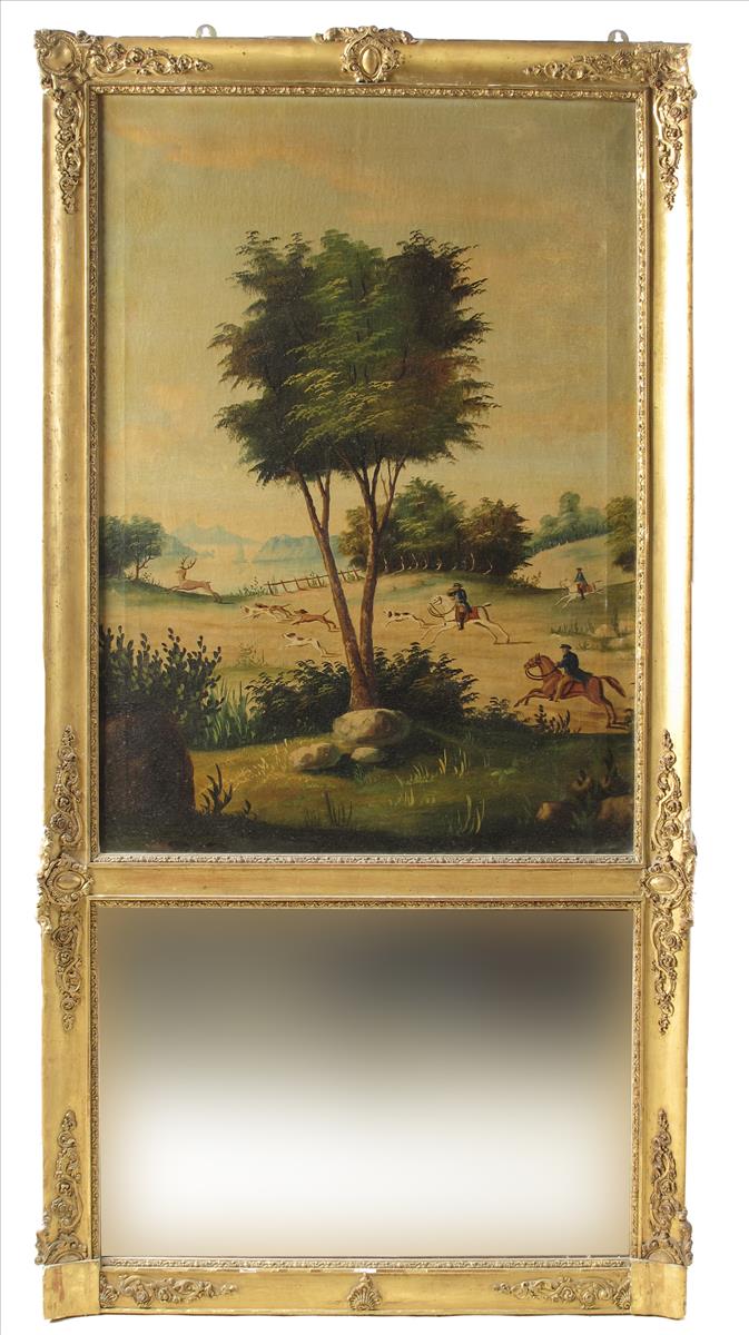 A 19th century French trumeau, painted a hunting scene above a rectangular plate to a moulded gilt and gesso frame, 58 x 29½in (147.7 x 75cm).