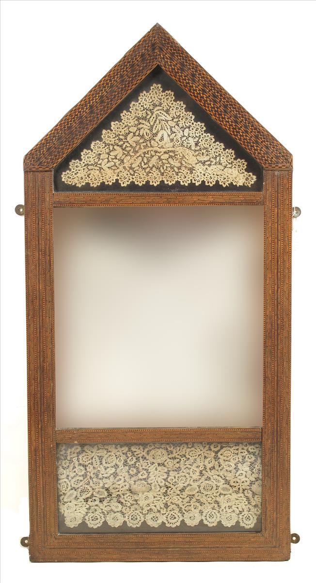 A continental parquetry frame mirror, inset two lace panels, 19th century, possibly Italian, 45¾ x 22½in (116 x 57cm).
