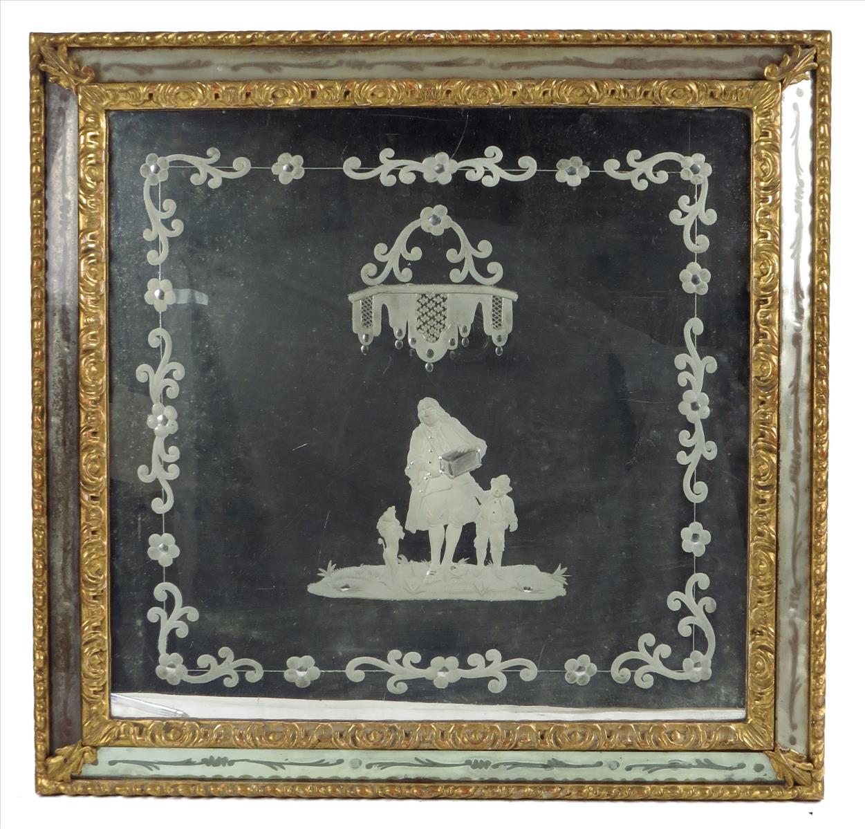 An etched glass, giltwood and gesso frame wall mirror, depicting a man playing a musical box with a child and a poodle, with marginal plates, 20 x 20¾in (50.8 x 52.8cm).