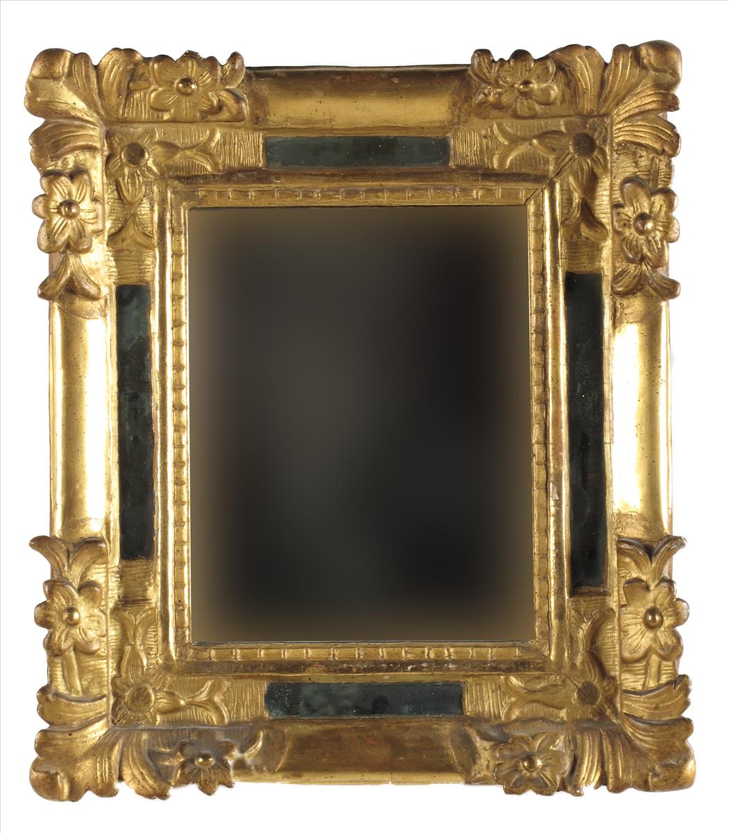 An Italian giltwood and gesso wall mirror, with a replaced rectangular plate, 16½ x 14½in (42 x 37cm).