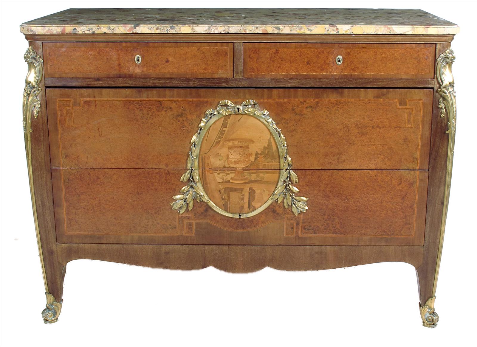 A late 19th century French amboyna, mahogany and marquetry commode, with ormolu mounts, the moulded edge brêche d'alep above two frieze drawers and two long drawers inlaid an oval panel, with urns in a garden within a ribbon tied laurel frame, 49in (124.5cm) wide, 24½in (62cm) deep.