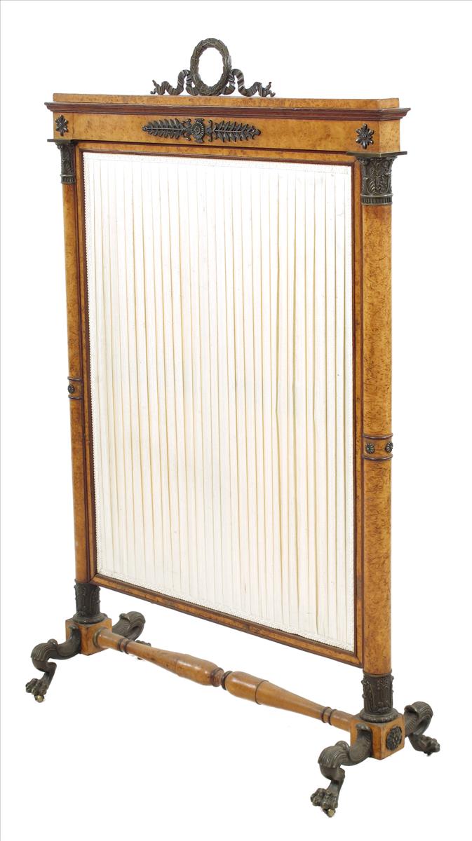 A Louis Phillipe burr walnut, purpleheart and bronze mounted firescreen, with a ribbon tied laurel wreath handle, above a pleated panel flanked by Corinthian capital columns on paw feet and brass roller castors, 43in (108.8cm) high, 27¼in (69.1cm) wide, 10¼in (26cm) deep.