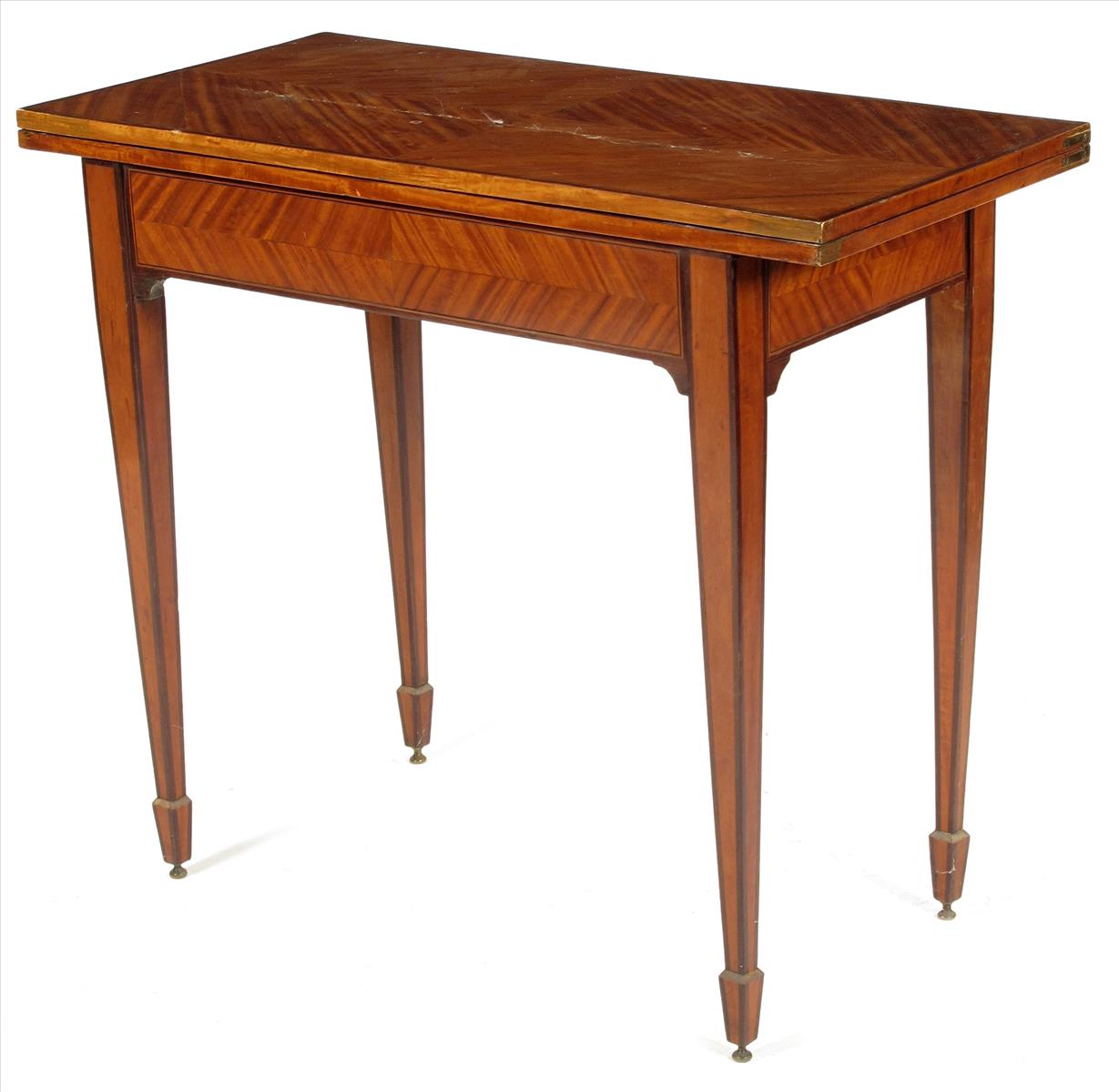 A 19th century French satinwood card table, with stringing and banding, the reverse with pull-out drawer supports, 29¾in (75.5cm) high, 34in (86.3cm) wide, 16¾in (42.5) deep.