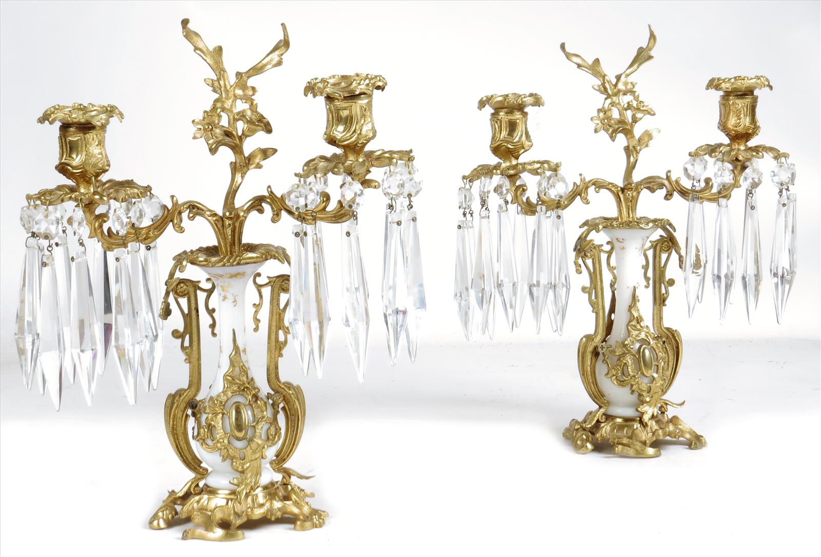 A pair of 19th century French ormolu and glass candelabra, 11¾in (30cm) high. (2)