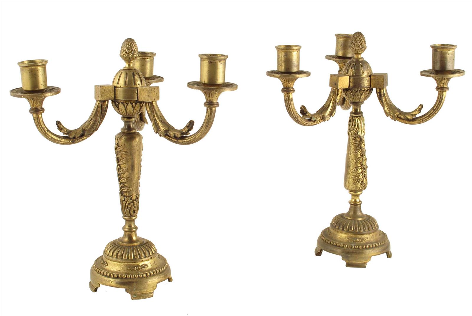 A pair of Louis XVI style ormolu three light candelabra