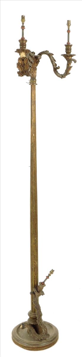 A giltwood lamp, with three gilt plaster scroll leaf arms, 71in (180.5cm) high.