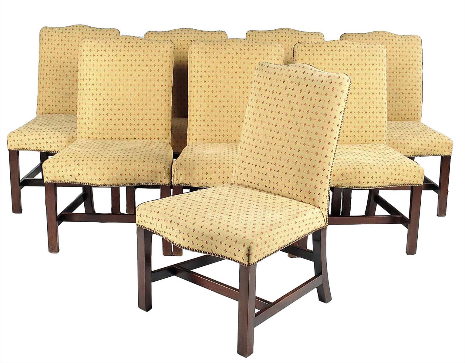 A set of eight mahogany dining chairs, each with an arched padded back to a serpentine front seat on chamfered square supports, united by a 'H' stretchers, George III and later. (8)