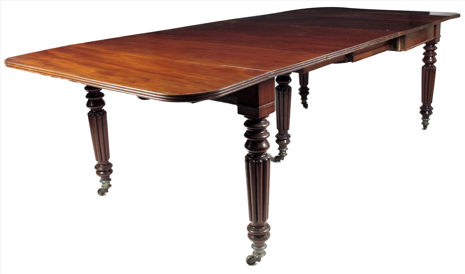 A George IV mahogany extending dining table, the reeded edge top with drop-leaf ends and two additional leaves on a telescopic frame on ribbed legs with a central support and brass castors, 29in (73.3cm) high, 98in (249.1cm) extended, 44in (111.3cm) deep.