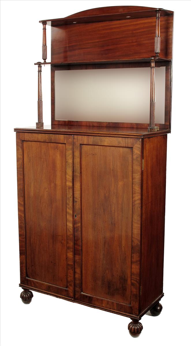 A George IV mahogany side cabinet, with a raised mirror back, the base with three adjustable shelves, 41½in (105cm) high excluding back, 31½in (79.6cm) wide, 13¾in (35cm) deep.