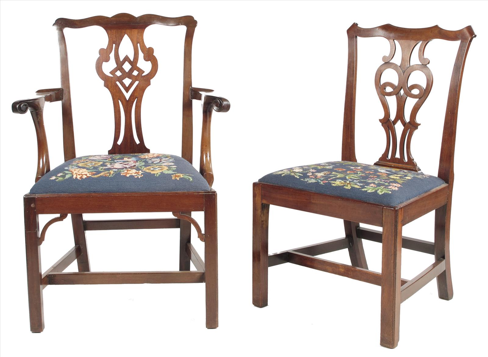A harlequin set of seven late George III mahogany dining chairs, comprising: two open armchairs and five side chairs. (7)