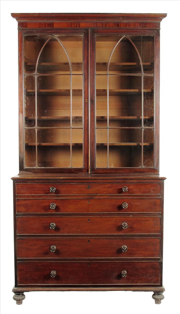 A William IV mahogany secretaire bookcase, by T. Wilson, London, the drawer with satinwood veneered drawers and pigeon holes, the front stamped 'T WILSON 68 GREAT QUEEN STREET LONDON', 89in (226cm) high, 48in (122cm) wide, 23in (58.5cm) deep.