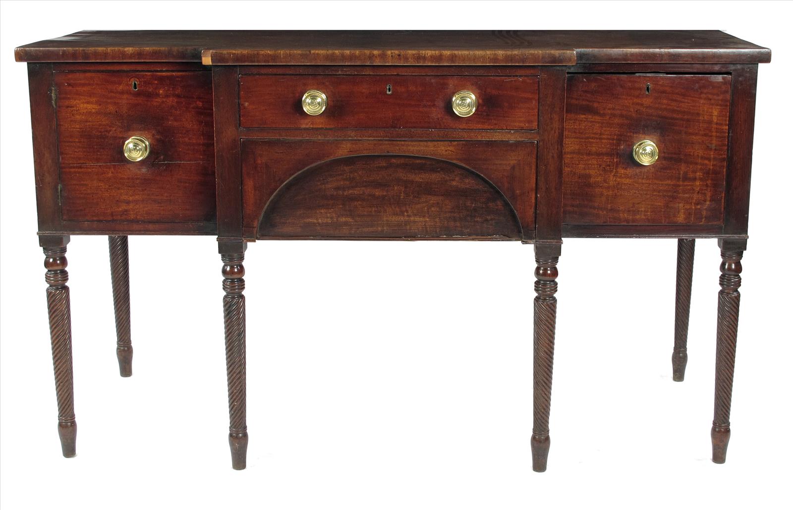 An early 19th century mahogany breakfront sideboard, the arched front drawer with a secret release, 37in (94cm) high, 62½in (159cm) wide, 26½in (67.4cm) deep.