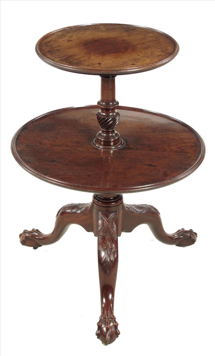 A mahogany two tier dumb waiter, revolving with raised moulded edges on carved cabriole legs to claw and ball feet, early George III and reduced, 32in (81cm) high, 25in (63.5cm) wide.