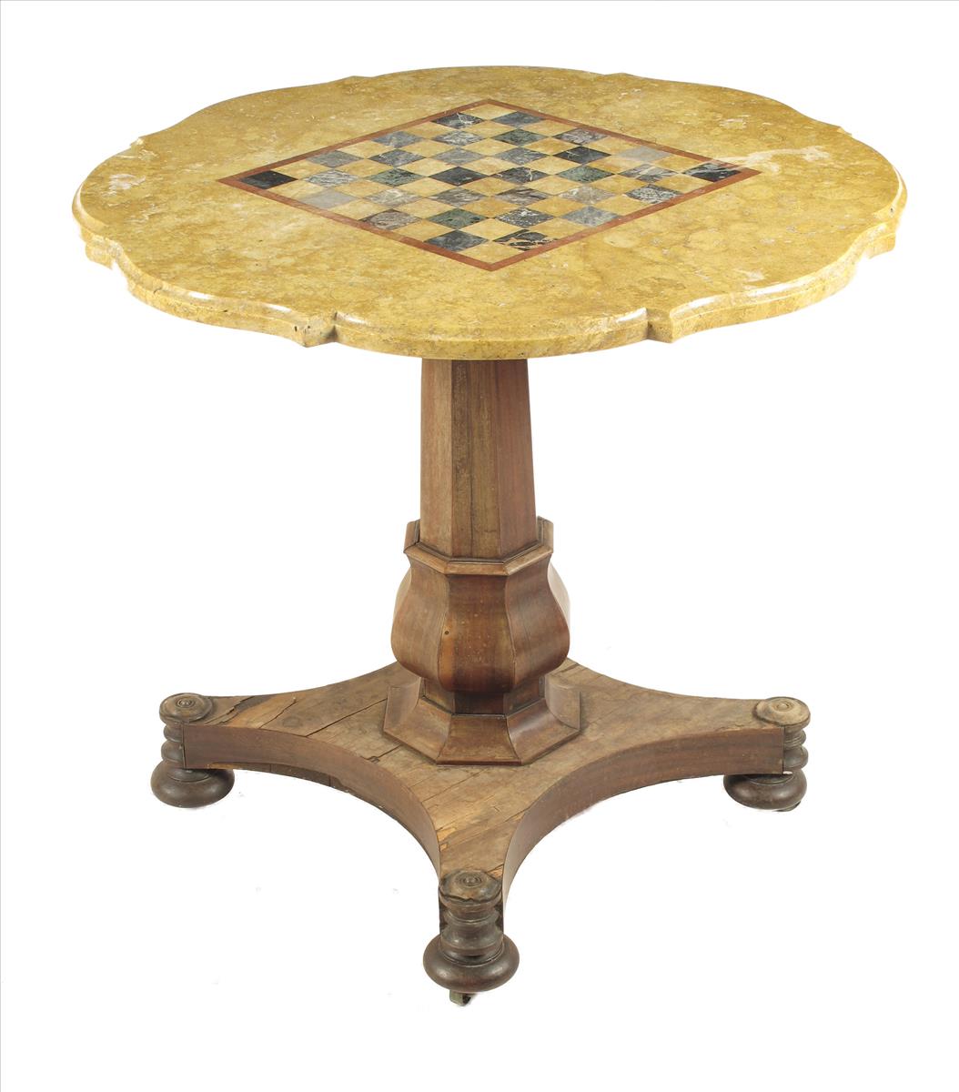 A specimen marble games table, the moulded edge shaped top, to an inlaid chequer board, on a rosewood base with brass castors, 19th century but top and base associated, 29½in (75cm) high, 32in (81.3cm) wide.