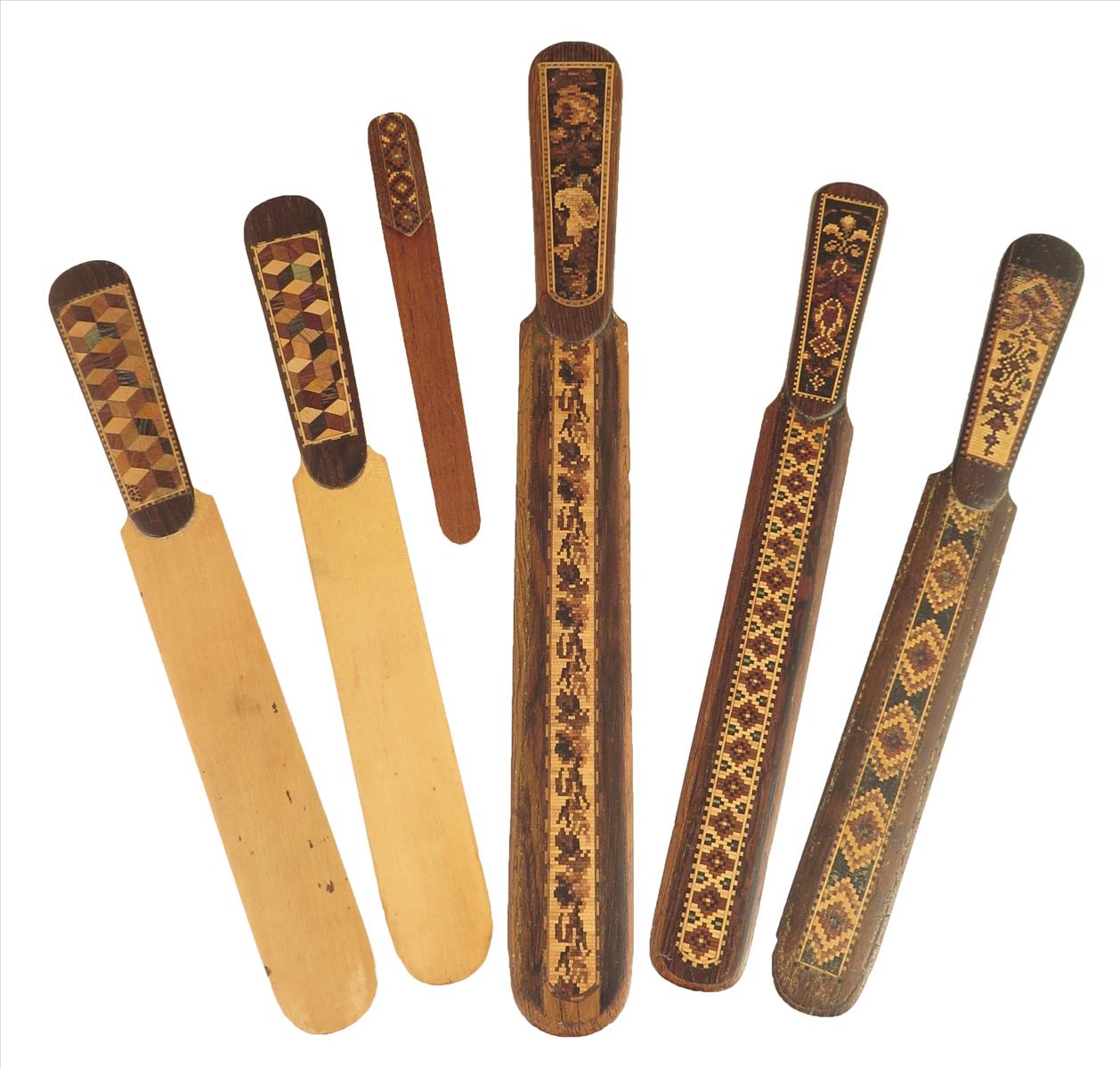 Five Victorian Tunbridge ware page turners, the largest attributed to Thomas Barton, three all over decorated with a combination of specimen wood parquetry, geometric and floral designs, together with a bookmark, 12ΒΌ (31cm) long, max. (6)
