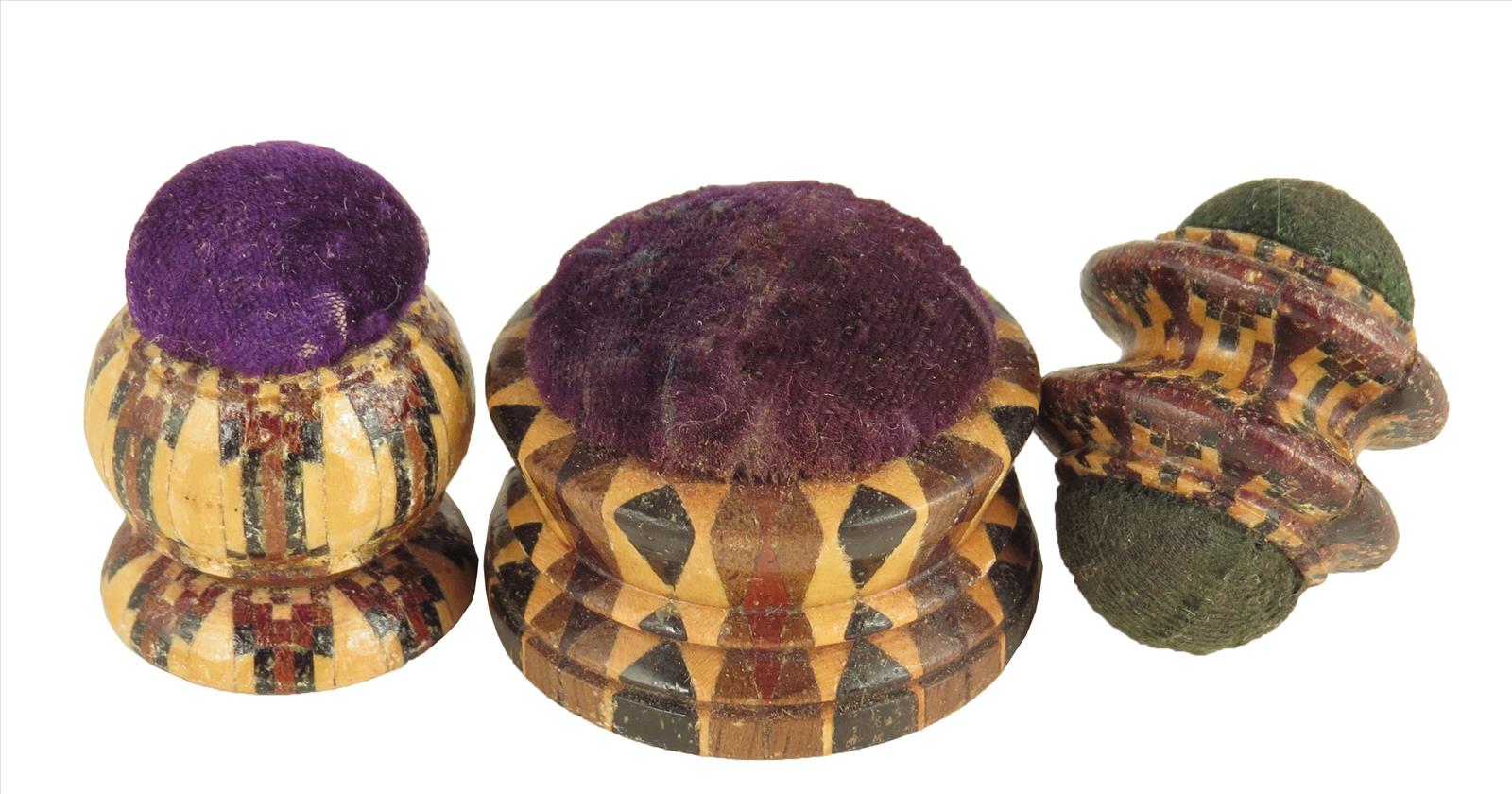 A Victorian Tunbridge ware stickware pin cushion by Thomas Barton, the base with a printed paper label inscribed 'T. BARTON, late NYE, Manufacturer, MOUNT EPHRAIM AND PARADE, Tunbridge Wells,' 1½in (3.4cm) diameter and two other stickware pin cushions. (3)
