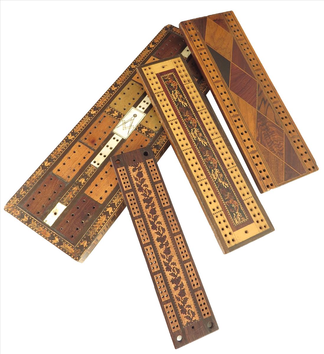 ‡Four Victorian Tunbridge ware cribbage boards