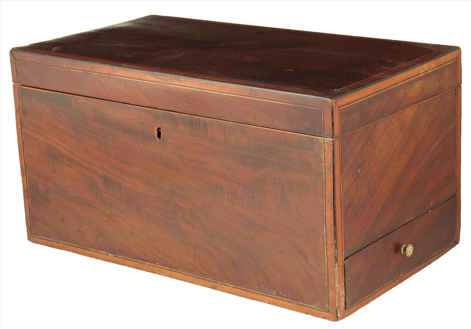 A late George III mahogany box, with satinwood banding and ebonised and boxwood stringing, with a green paper lined interior to a divided base drawer, 8½in (21.5cm) high, 16in (40.3cm) wide, 9¼in (23.5cm) deep.
