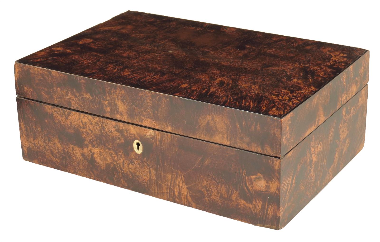 An early 19th century stained maple sewing box, with a mirror to the inside of the lid and a paper lined interior, with a divided lift-out tray, 4¾in (11.8cm) high, 13in (32.5cm) wide, 9in (22cm) deep.
