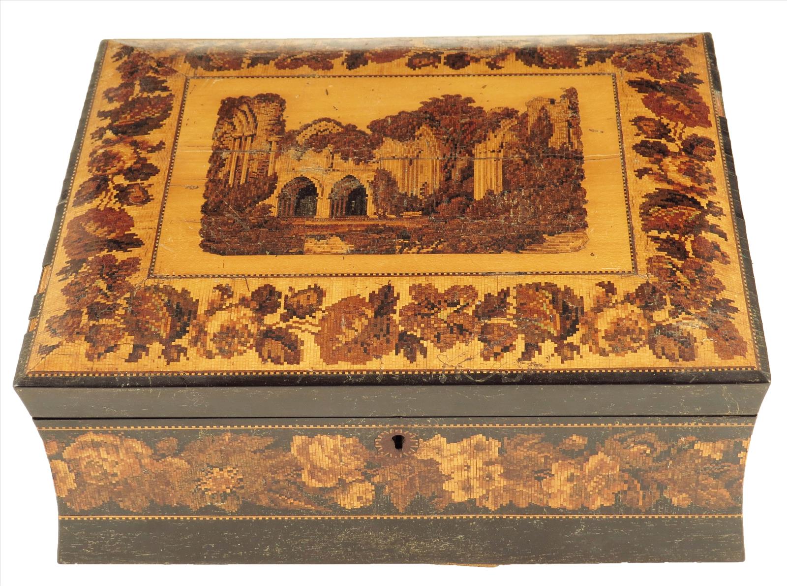 A Victorian Tunbridge ware and ebony sewing box attributed to Thomas Barton, the hinged lid decorated a view of Bayham Abbey, East Sussex, within bands of flowers the inside of the lid with Prince Edward with a spaniel and a falcon, to a silk and paper lined lift-out tray with divisions and lidded compartments, the brass lock stamped 'TURNER MAKER, CITY ROAD LONDON', 4in (10.5cm) high, 10¾in (27cm) wide, 8¾in (21.8cm) deep.