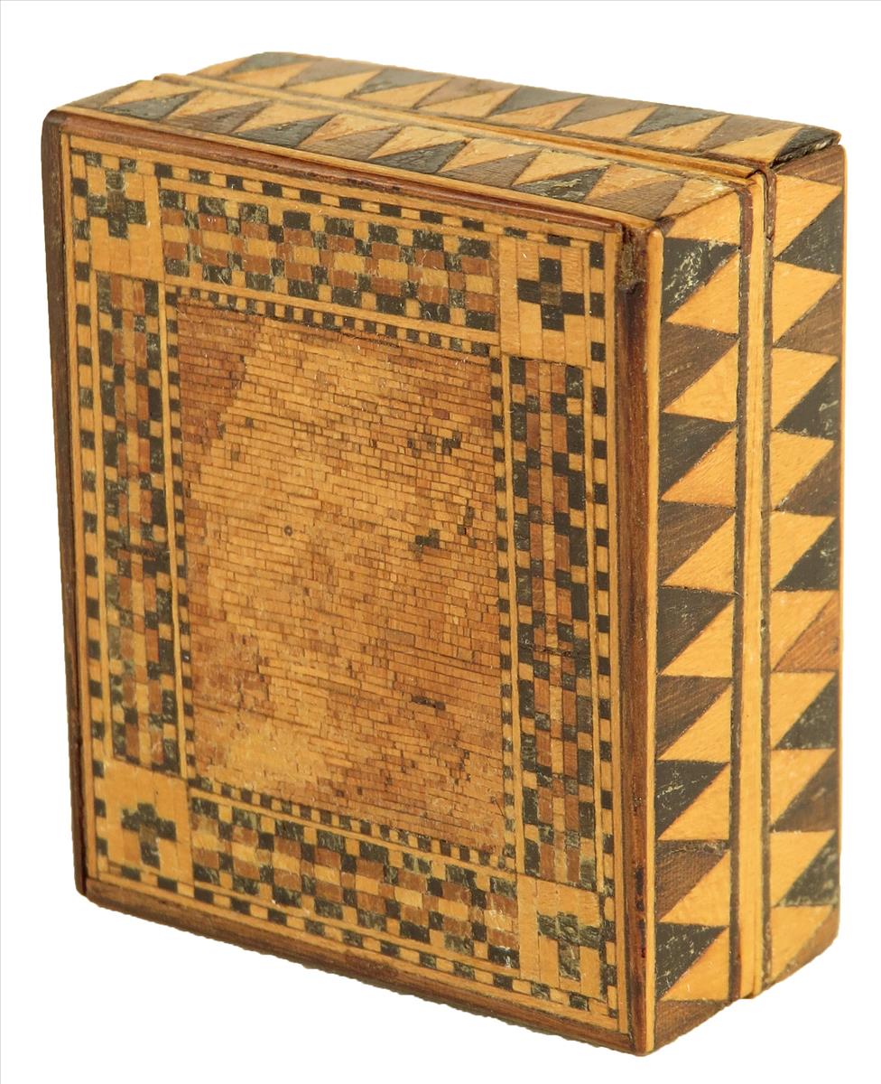 A Victorian Tunbridge ware stamp box, the lid decorated with a profile bust of Queen Victoria in fine detail with more than one thousand tesserae, the top stickware decorated, the sides with vandykes, 1¼in (3.4cm) wide, 1½in (4cm) deep.