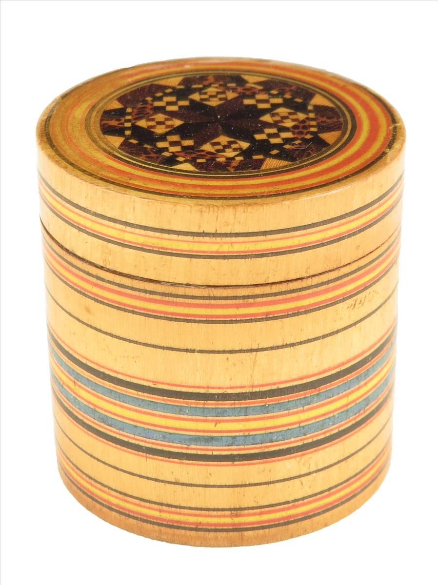 A very rare Tunbridge ware whitewood cylindrical box and cover attributed to Edmund Nye, the lid with a parquetry star, the body with bands of decoration, 2in (5cm) high, 1¾in (4.3cm) wide.
