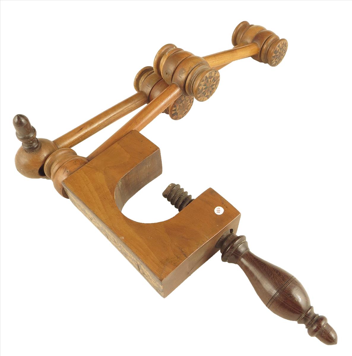 ‡A Victorian Tunbridge ware table clamping screen-holder attributed to Thomas Barton, with turned rosewood handles, 8½in (21.6cm) high, 22¼in (56.5cm) extended.