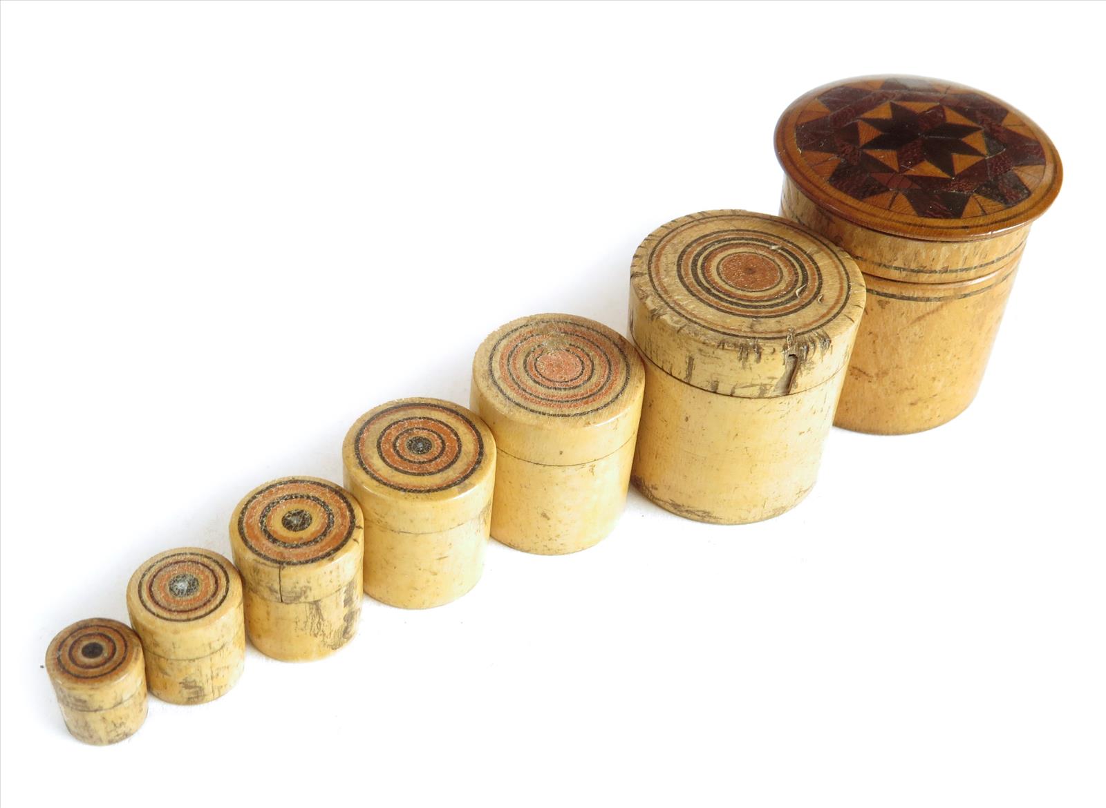 A rare early 19th century Tunbridge ware whitewood nest of seven lidded containers attributed to Edmund Nye, the largest inlaid a parquetry star, the others painted with radiating designs, 1ΒΌ (2.7cm) high, 1in (2.5cm) wide, max.