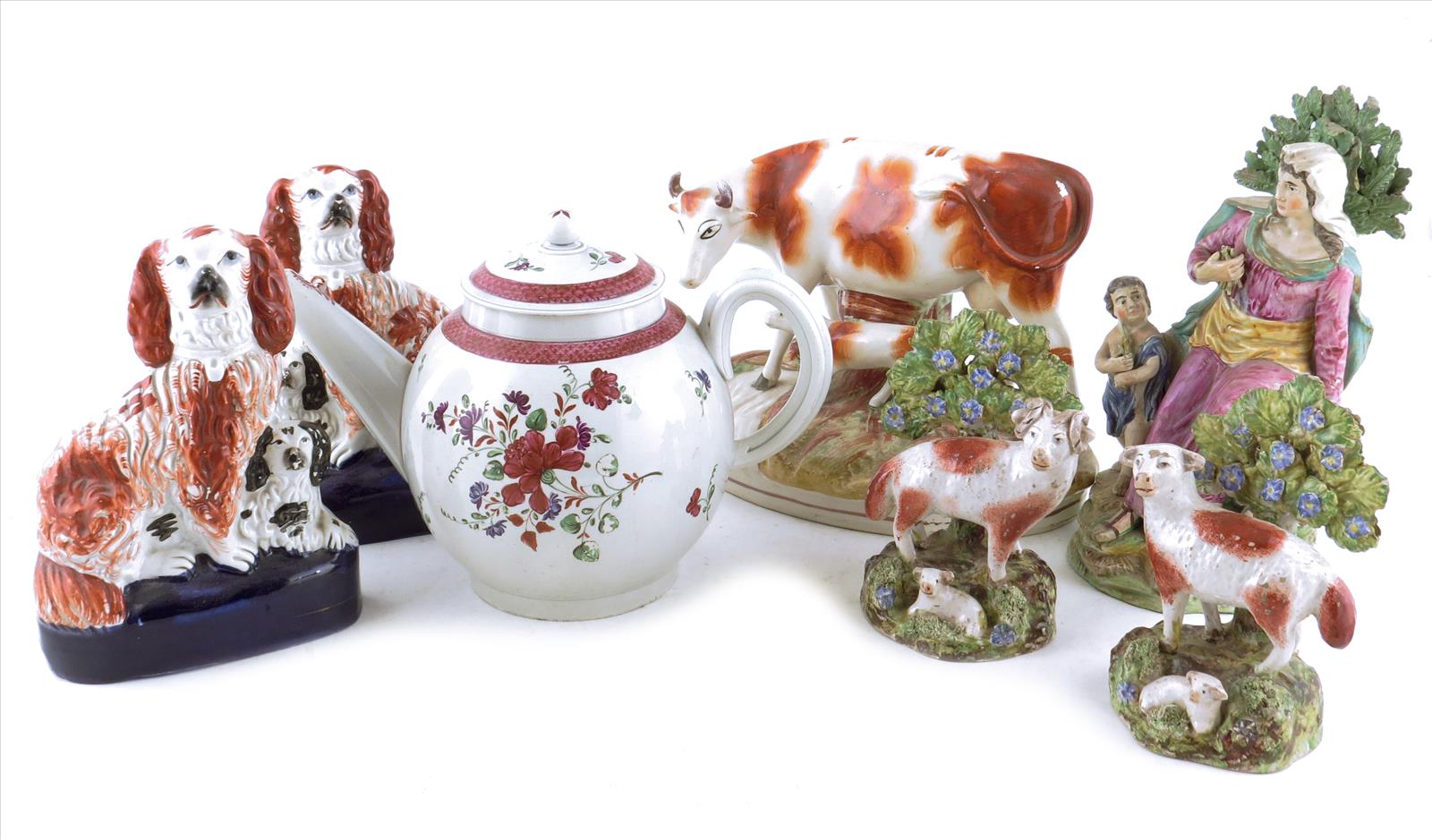 A 19th century pearlware teapot and cover, with painted floral decoration, 7½in (19cm) high, a pair of Staffordshire twin spaniel groups, 8in (20cm) high, a Staffordshire cow and calf group, and a pair of Walton pearlware ram, ewe and lamb groups, 6in (15.2cm) high, and a Staffordshire group of a seated lady with putti, 9½in (24cm) high. (7)