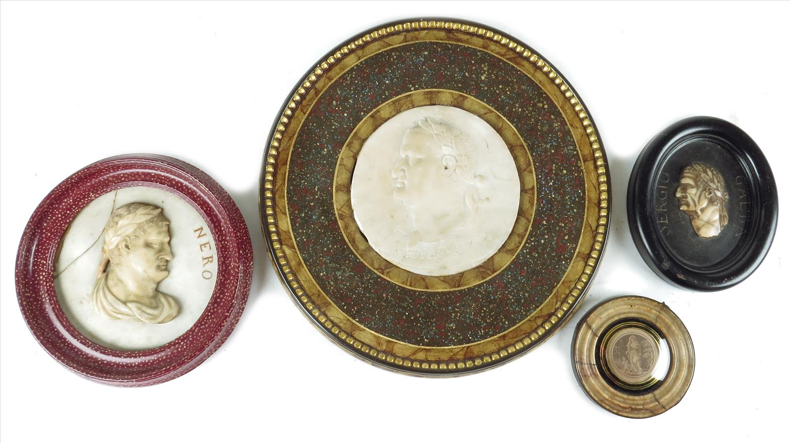 Three Italian Grand Tour carved marble profile relief busts of Roman emperors, titled 'SERGIO GALBA', 'NERO' and 'VESPAS AUG', in painted wood frames, 13¾in (34.8cm) diameter, together with a classical engraving within a moulded marble frame, 19th century and later. (4)