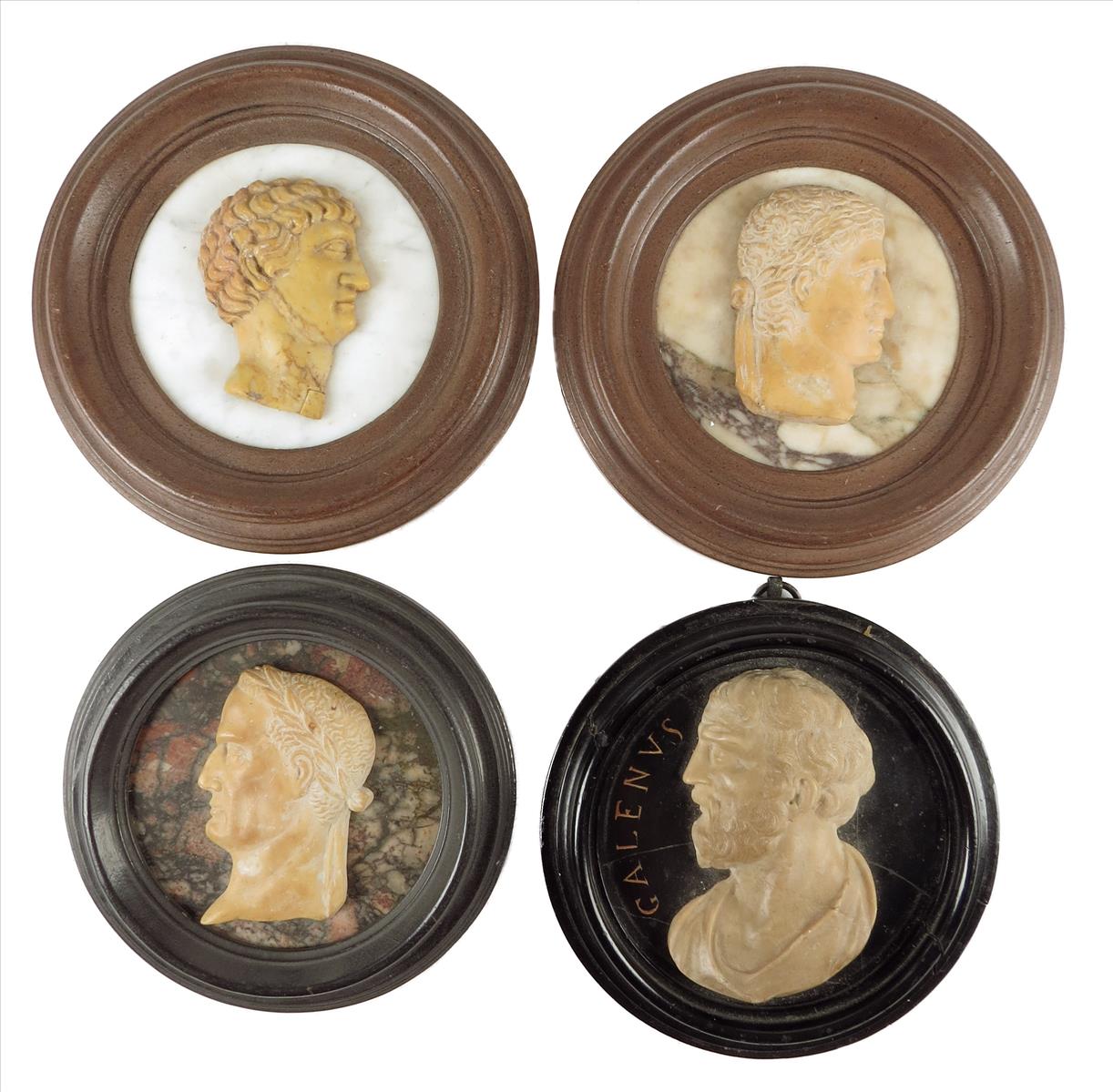 Four Italian Grand Tour carved marble profile relief busts of prominent Romans, one of Galenus, the prominent physician and philosopher, the others possibly of Emperors, in painted wood frames, 19th century and later, 9¼in (23cm) diameter. (4)